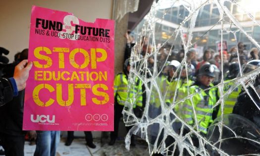 Estudantes protestam em frente à sede do Partido Conservador em Londres. Os manifestantes são contra projeto de aumento das mensalidades e corte de repasses às universidades.