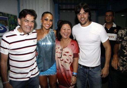 Ao lado dos pais, Omar e Aparecida, e do namorado, Fábio Farias, Sabrina Sato se prepara para receber a coroa de rainha de bateria da Vila Isabel, na quadra da escola de samba, na zona norte do Rio (13/11/2010).