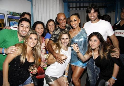 Ao lado do namorado, Fábio Farias (de camiseta branca), do promoter Amin Khader (de preto) e de amigos e familiares, Sabrina Sato se prepara para ser coroada a nova rainha de bateria da Vila Isabel, na quadra da escola de samba, na zona norte do Rio (13/11/2010).