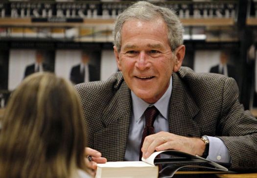 O ex-presidente dos EUA George W. Bush conversa com garota de oito anos no lançamento de seu livro autobiográfico, intitulado "Pontos de Decisão", em uma loja perto de sua casa, em Dallas.